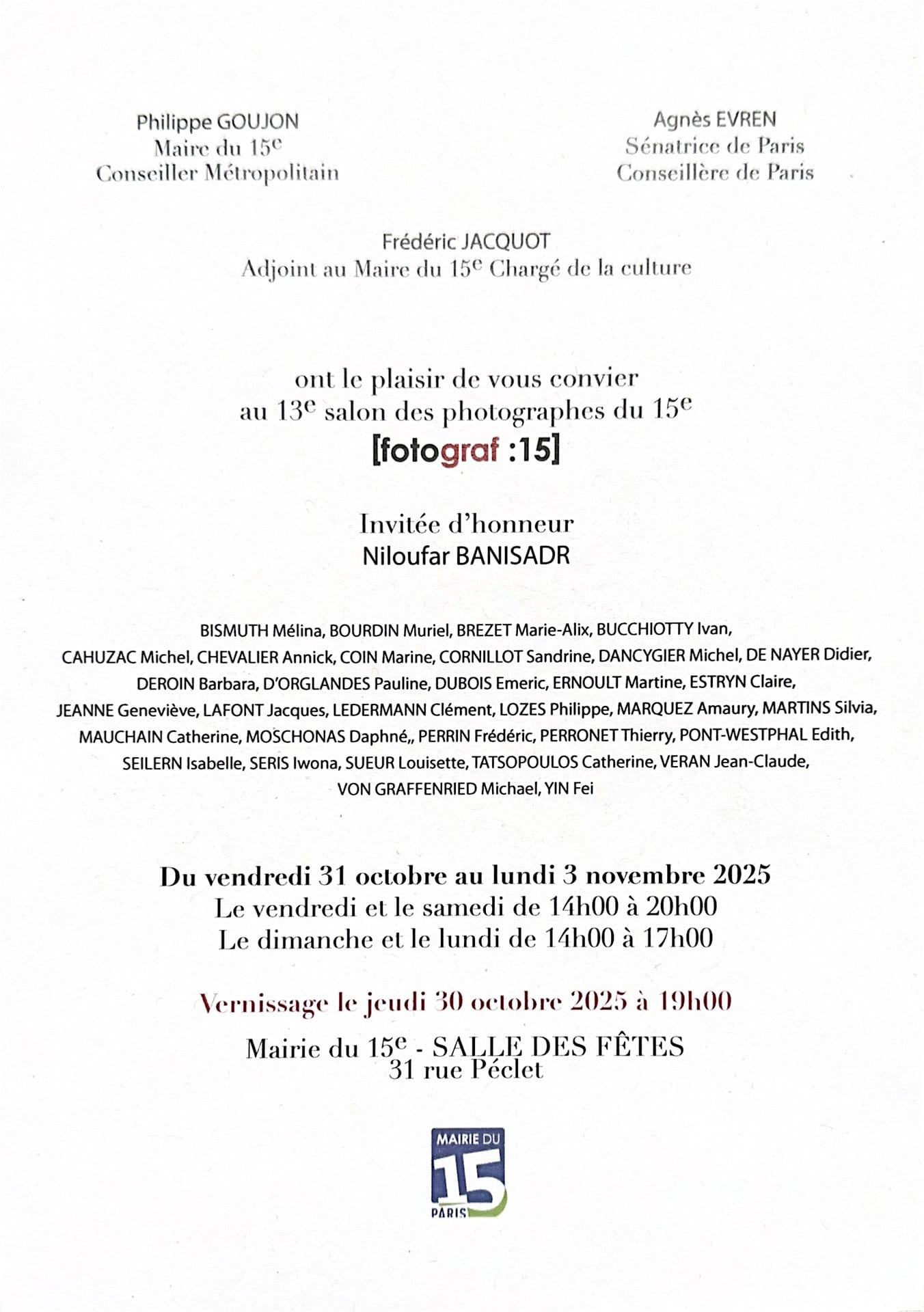 Frédéric Perrin-Pilatus expose une série de ses photographies à la Mairie du 15ème arrondissement de Paris, du vendredi 31 octobre au lundi 3 novembre 2025.